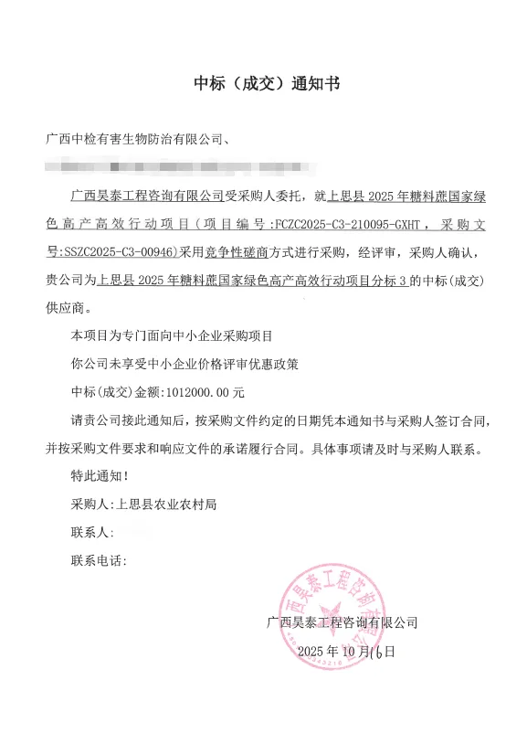 近日,广西中检有害生物防治有限公司(以下简称“防治公司”)成功中标防城港市上思县2025年糖料蔗国家绿色高产高效行动政府采购项目分标3赤眼蜂释放服务项目。