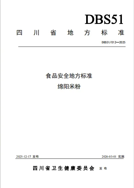 近日,《食品安全地方标准 绵阳米粉》(DBS51/012—2025),经四川省卫生健康委员会正式批准发布。中国中检四川公司作为该标准的核心技术支持单位,全程参与标准制定及技术验证工作。