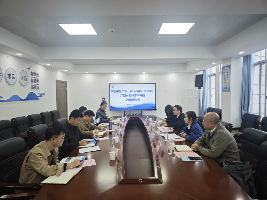 11月27日,中国中检广西公司(西南区域总部)党委委员、副总经理江荆一行拜访广西壮族自治区水利科学研究院(以下简称“广西水科院”),与广西水科院党委副书记、副院长吴卫熊座谈交流。