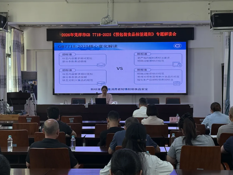近日,中国中检西南区域公司受凭祥市市场监督管理局邀请,前往凭祥开展GB 7718-2025《食品安全国家标准预包装食品标签通则》专项宣贯培训。凭祥及周边地区的各类食品企业代表参加了此次培训。